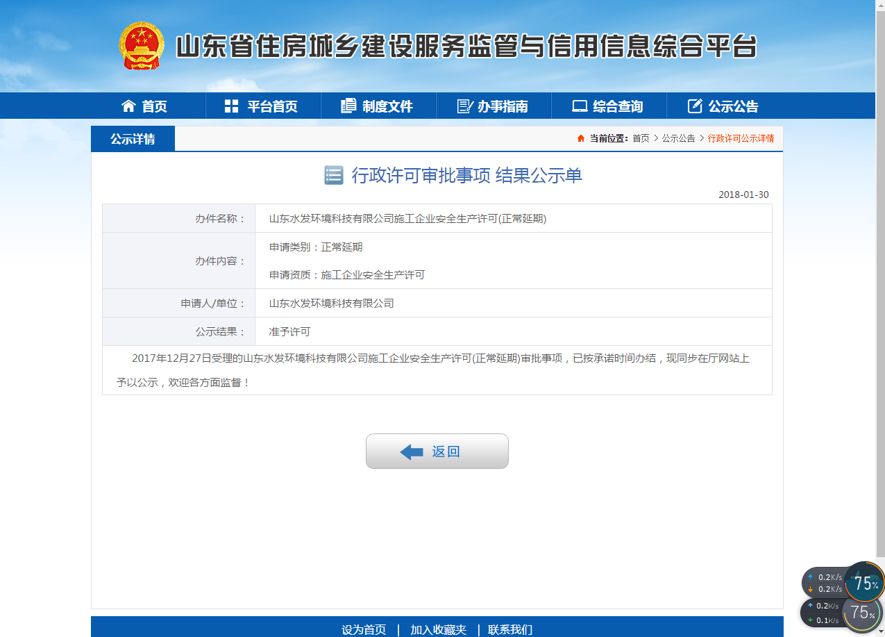 1月30日,山東省住房城鄉(xiāng)建設(shè)服務(wù)監(jiān)管與信用信息綜合平臺發(fā)布公示,山東水發(fā)環(huán)境科技有限公司成功獲得2018-2021年山東省施工企業(yè)安全生產(chǎn)許可,并于當(dāng)日進(jìn)行公示。